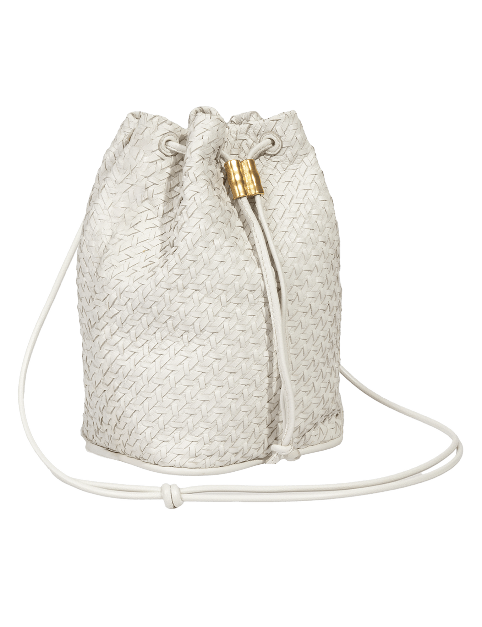 Fechamento feito por um cordão de couro mais puxador de metal banhado a ouro com textura levemente amassada