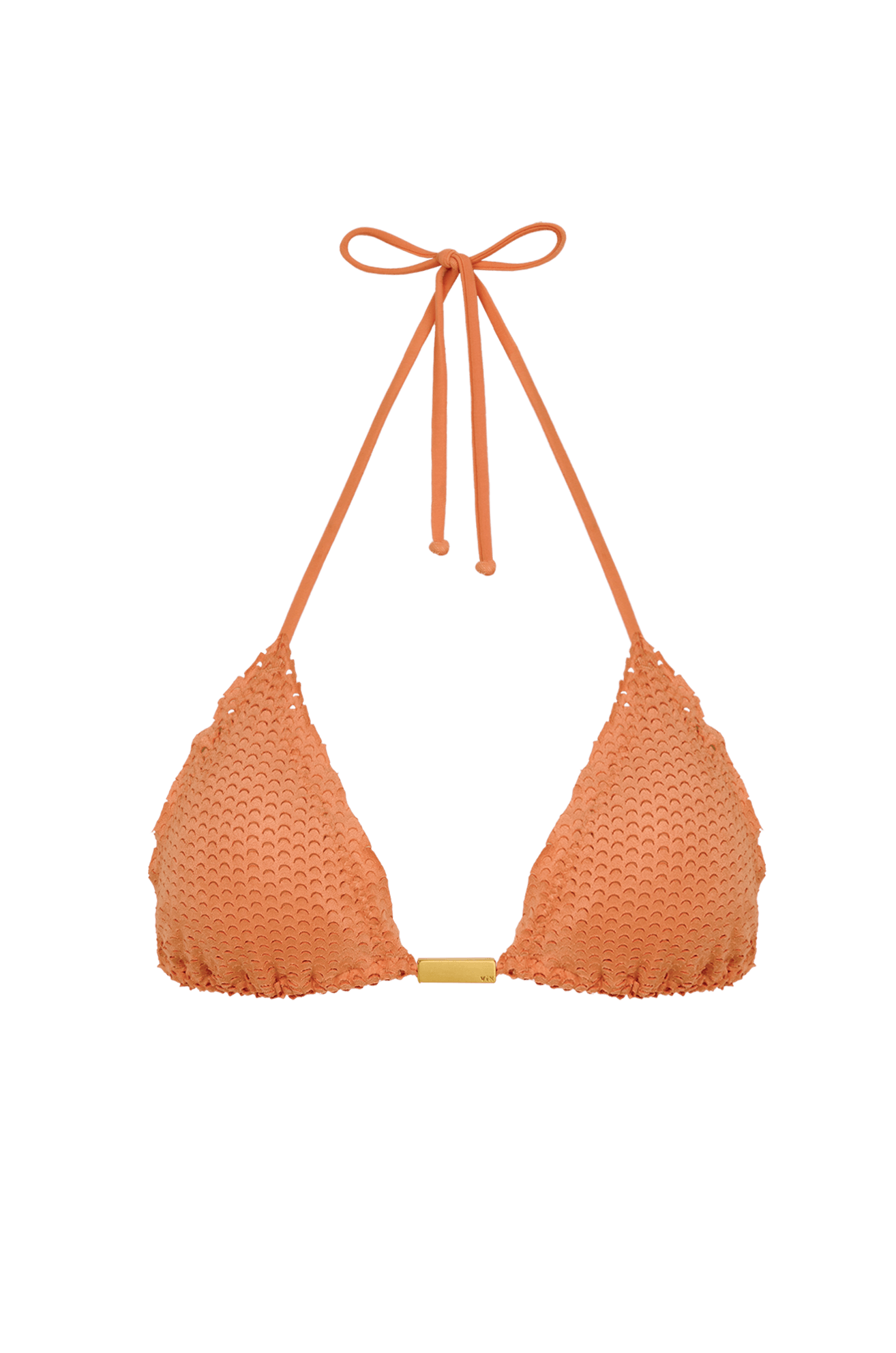 A modelagem Tri tem o top de biquíni laranja em shape triângulo ajustável com amarração nas costas e no pescoço.